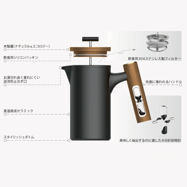 セラミックボディで木製ハンドルに砂時計をデザインした機能性に優れお洒落な最高級フレンチプレス