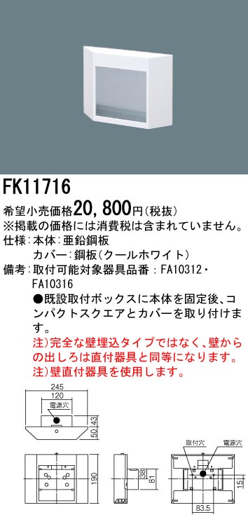 仕様・注意事項 使用に関しての留意点 ◆【本体】亜鉛鋼板 ◆【カバー】鋼板(クールホワイト) ◆●既設取付ボックスに本体を固定後、コンパクトスクエアとカバーを取り付けます。 【取付可能対象器具品番】FA10312 【取付可能対象器具品番】FA10316 ◆注)完全な壁埋込タイプではなく、壁からの出しろは直付器具と同等になります。 ◆注)壁直付器具を使用します。