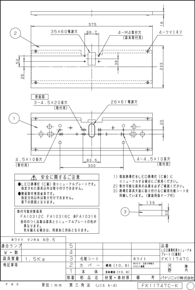【メーカー保証】【在庫あり】PANASONIC パナソニック FK11747C 壁直付型 誘導灯リニューアルプレート C級(10形)